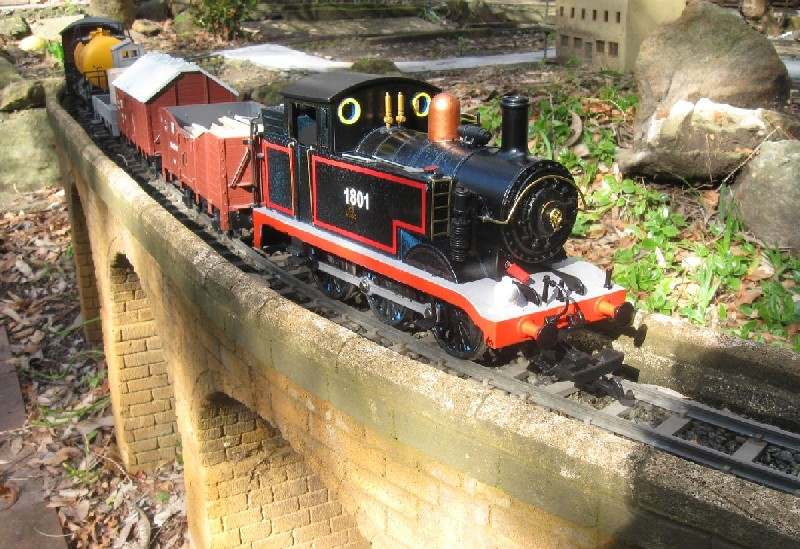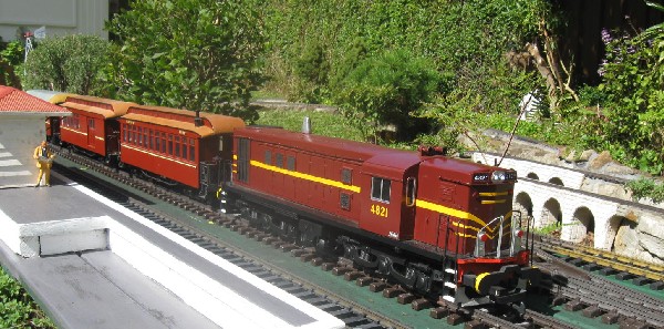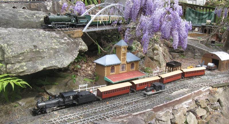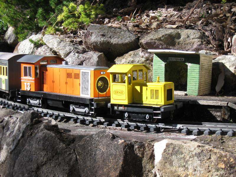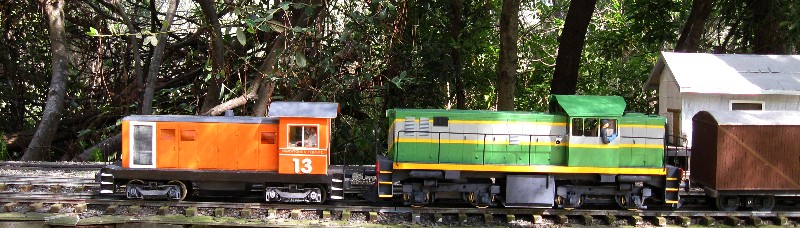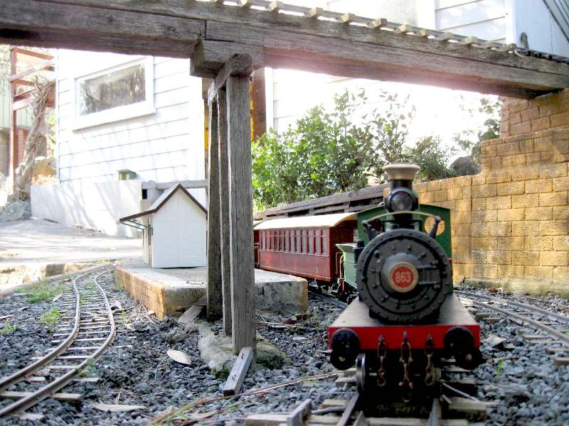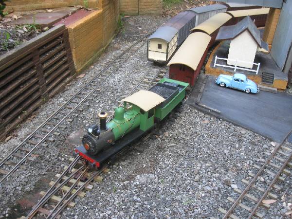 The SaTR had a visit from Bill Cooper. Here's his Hill End diesel and in the background, his mogul on a passenger train at Ti-tree. Greg's 19 class is in the platform road with a mixed goods.