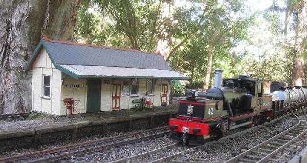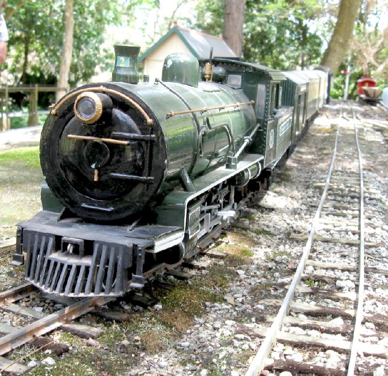 Geof's mogul hauls Geoff Hallam's English passenger cars through Melaleuca on the SaTR 16/8/08