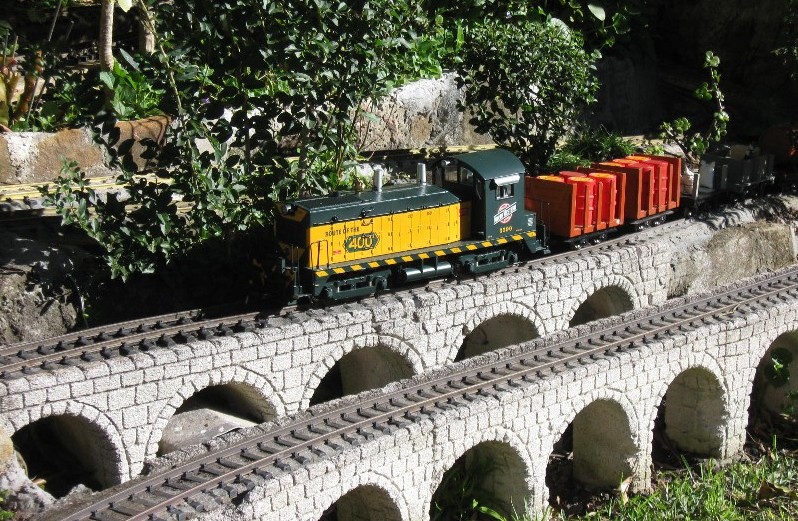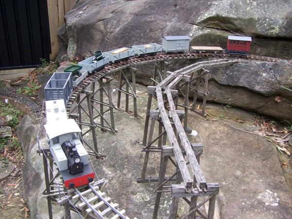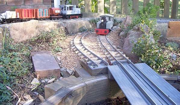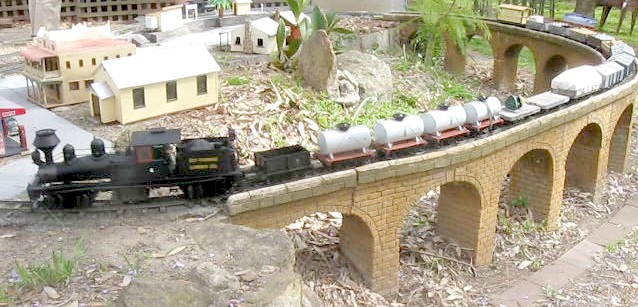 Overall view of Sandstone. Geof's Queensland train and smal Dunkirk loco at station. Greg's express on bridge.
