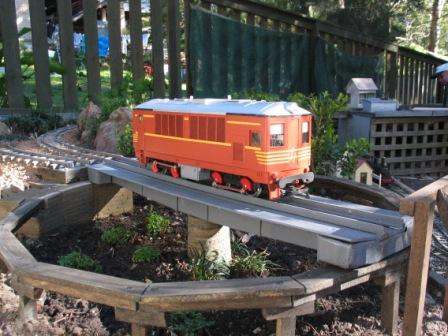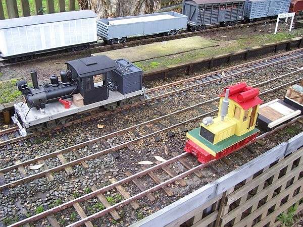 Geof's loco heads for the turntable while Bryan's diesel passes by.