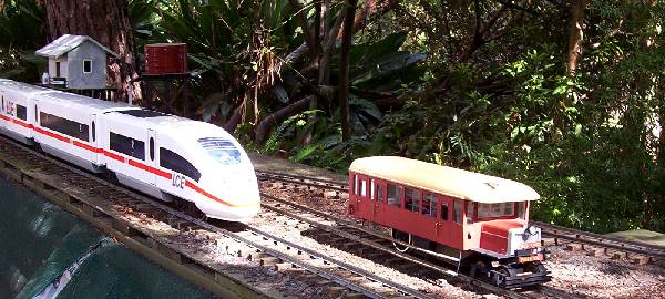 The future and the Past. Bryan's LCE set passes Geof's old Queensland railmotor "Red Fred" 16/8/08