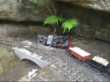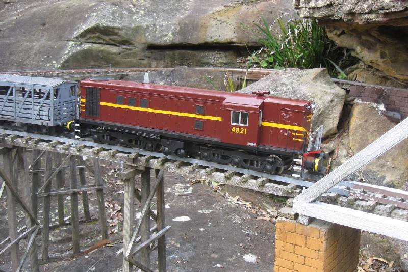 Keith's new RS3 (it will become a NSW 40 class - he's already added a 3rd axle to the bogie) and Greg's new orange diesel double head through Sandstone. The new diesel needs more weight in it, and stuck up on the hill so needed assistance.