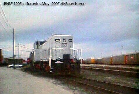 BNSF 1205 in Toronto, ON awaiting shipment to Kansas. May 2007. Photo by Brian Hume. Click to enlarge. |