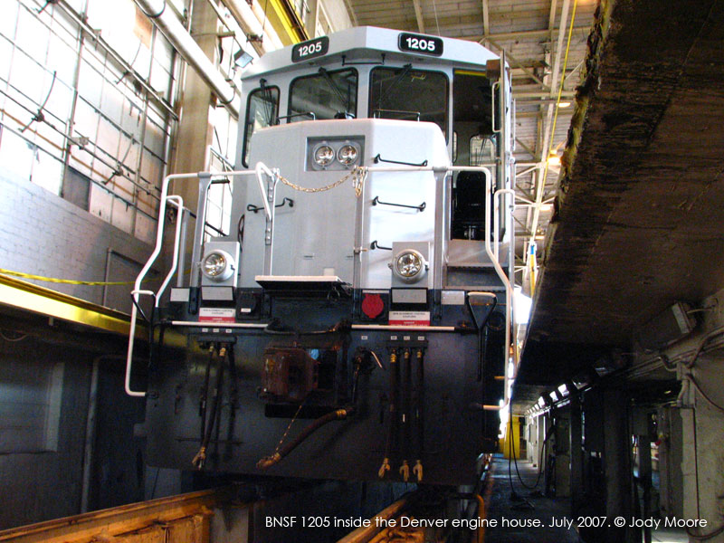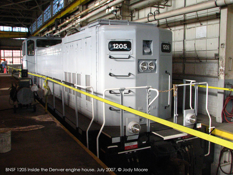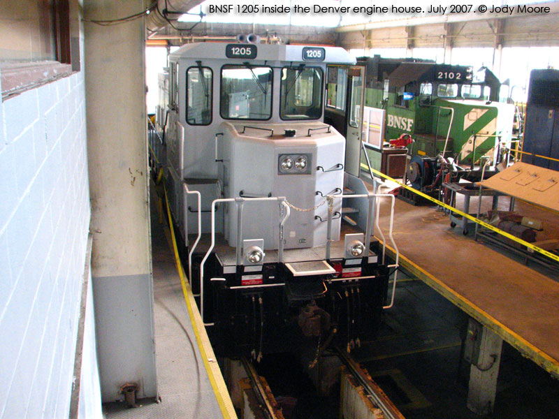 BNSF 1205 inside the BNSF Denver, CO engine house, still in primer prior to fuelcell conversion. July 18, 2007. Photo by Jody Moore. Click to enlarge. |
