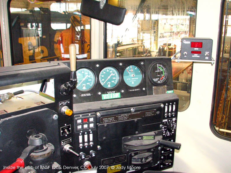 The cab of BNSF 1205 inside the BNSF Denver, CO engine house. At this point, the number 1704 was still stencilled on the cab wall above the engineer's seat. July 18, 2007. Photo by Jody Moore. Click to enlarge. |