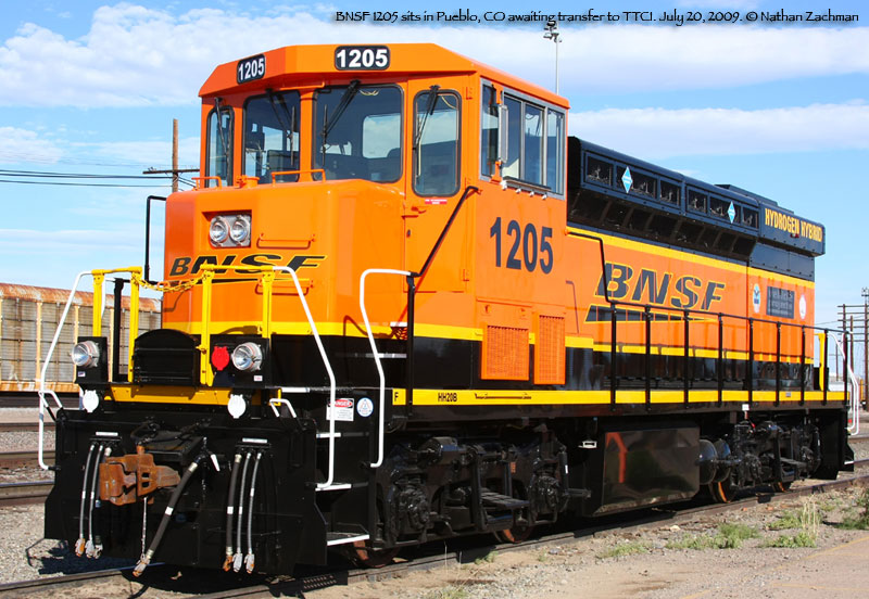 Completed BNSF fuel cell hybrid 1205 sits in Pueblo, CO on its way to TTCI for initial testing. July 20, 2009. Photo by Nate Zachman. Click to enlarge. |