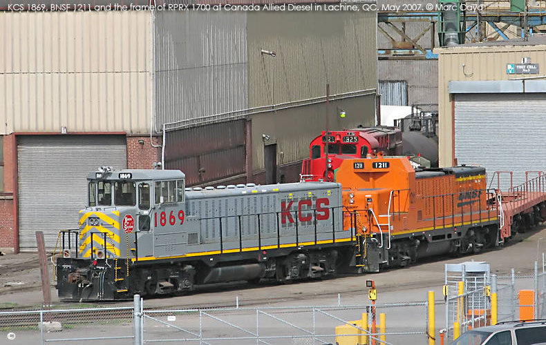 |KCS 1869, BNSF 1211 and RPRX 1700 at CAD in Lachine, QC. May 2007. Photo by Marc Caya. Click to enlarge. |
