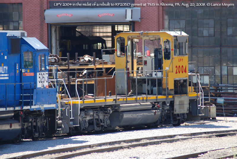 A hybrid nevermore. UPY 2004 in the midst of a heavy rebuild at TMS in Altoona. When she emerges again, the unit will be an RP20BD genset locomotive. Aug. 20, 2008. Photo by Lance Meyers. Click to enlarge. |