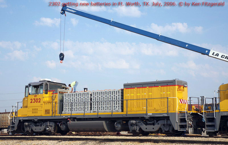 UPY 2301 in Fort Worth, TX July, 2006. At FWWR yard getting batteries replaced in mid-July. Info from UP equipment trace, battery info from Railspot users Mike Murray and Ken Fitzgerald. |