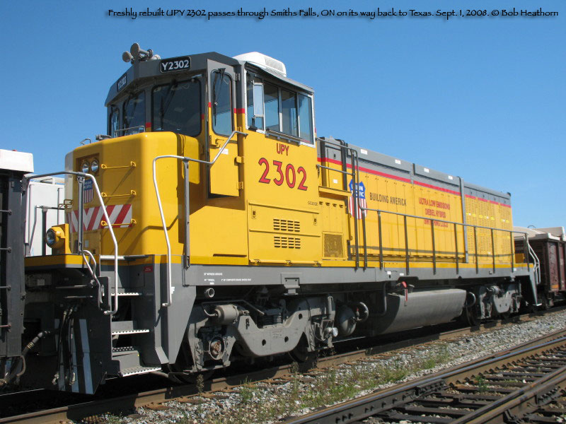 UPY 2302 passes through Smiths Falls, ON on CP train 235-31 after rebuild to Gen. IV. Photo by Bob Heathorn. Sept. 1, 2008. Click to enlarge. |