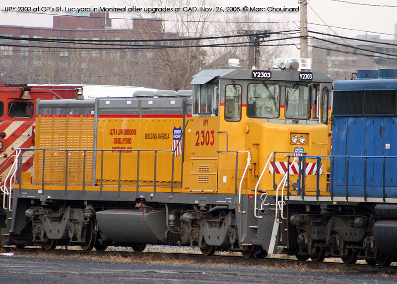 UPY 2303 has been upgraded to Gen. IV in this photo, and is sitting in CP's St. Luc (Montreal) yard awaiting shipment south. Photo by Marc Chouinard. Nov. 26, 2008. Click to enlarge. |