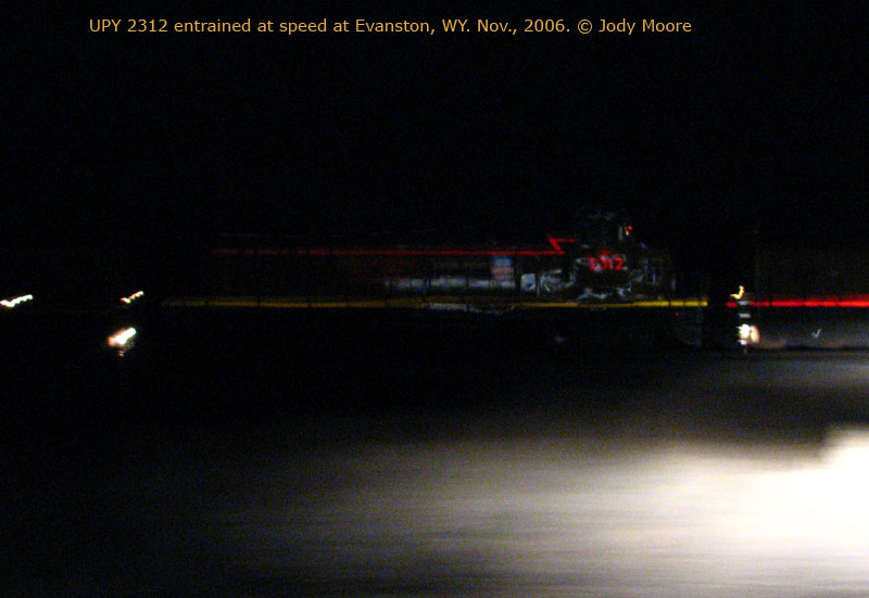 An absolutely horrible photo (by yours truly) of UPY 2312 in train at Evanston, WY in the black of night. Photo by Jody Moore. Nov., 2006. Click to enlarge. |