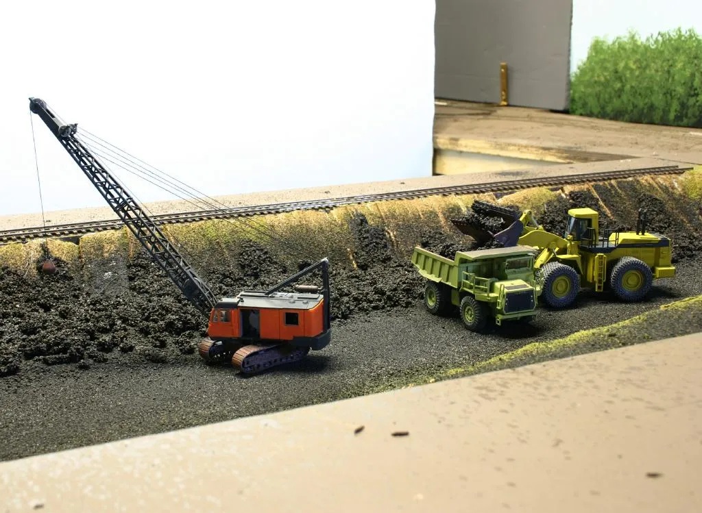 with the open clamshell bucket silhouetted against the 'blue sky' MDF backdrop