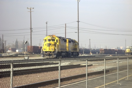 Two Freights in the first yard tracks. 5415 heading a Freight out of the yard for the desert.