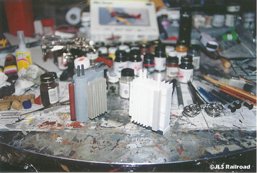 The transformers for the Power Plant under construction. One painted, one unfinished. Both were scratch built from Plastruct Parts.