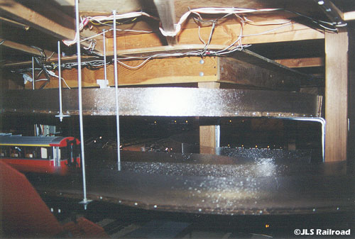 Two photos of the M-Yard viewed from outside of the H-Yard's table. Here, just barely, you can see the M-Yard in between the tiers of the Helix suspended beneath the table.