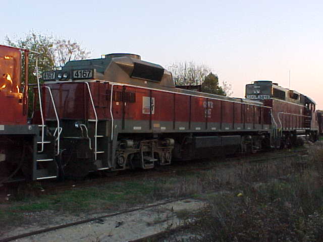 This is another picture of GSWR #1342 in Columbus.It usally shows up with the long hood toward the end of the lashup. Since they normally run at night or at least after supper, I haven't been able to verify whether they are running this locomotive long hood forward. Since the GP38s on the other end of the lashup are positioned short hood forward, maybe the GP38s are always the lead units. That would mean that they pull up into the NS yard in Columbus, deliver cars to NS, and then back their train inti their own yard! |