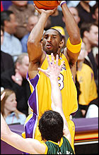1/7/03 Lakers 119 vs Sonics 98Lakers Subdue Sonics As Kobe Makes HistoryLOS ANGELES, Jan. 7 -- For 18 1/2 minutes, Kobe Bryant was having an ordinary game. For the next 22 1/2 minutes, he shot his way into history. Bryant scored 45 points and set NBA records with nine consecutive 3-pointers and 12 overall as the Los Angeles Lakers defeated the Seattle SuperSonics, 119-98, for their fourth win in five games. |