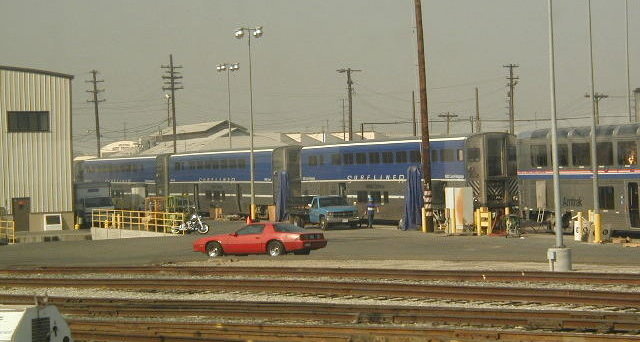 (60K) View of Amtrak facilities with Pacific Surfliner and Superliner Sightseer Lounge equipment visible. |