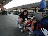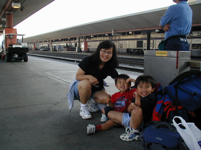 (62K) Dorie, Andrew, Nathan (and partially Les) at Los Angeles Union Station waiting for our train to be brought into station. We met SuperDave on the platform. In the background is the Amtrak Southwest Chief #3 which arrived late. We had to wait at Fullerton Junction for #3 to depart the station. |