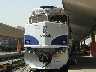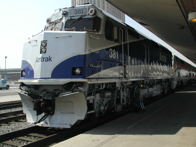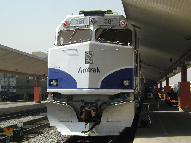 (60K) Front view of AMTK #381 F40PH in Pacific Surfliner paint scheme. |