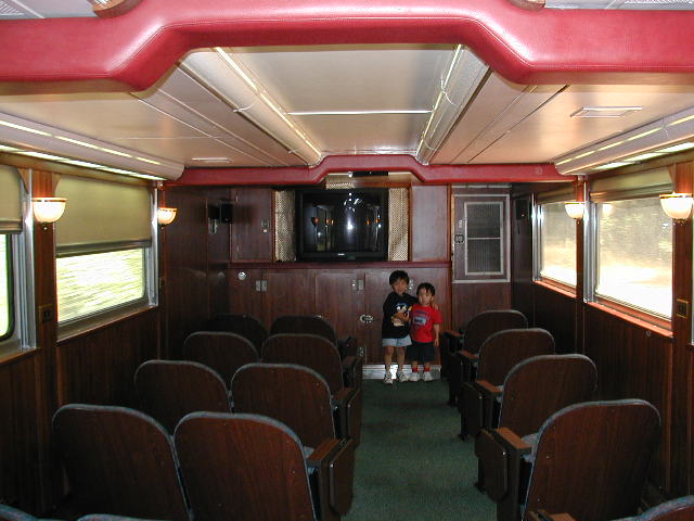 (60K) Nathan and Andrew downstairs in the Theater of the Pacific Parlour Car which is equipped with a 35" Sony TV, Hi-Fi VCR, and Surround Sound System. |