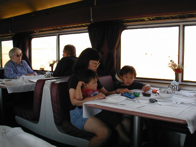 (67K) Nathan enjoying a bowl of Frosted Flakes in the Pacific Parlour Car (ex-Santa Fe hi-level lounge). |