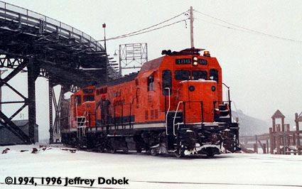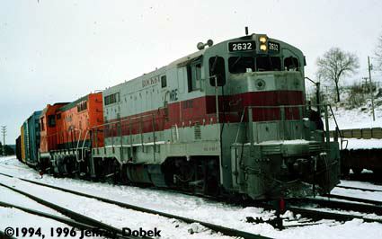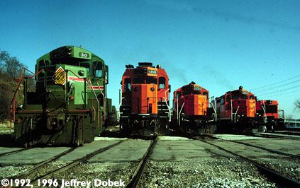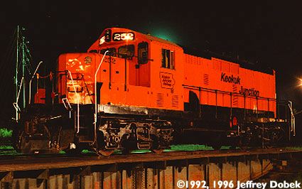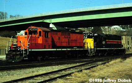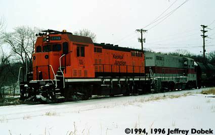 The KJRY re-equipped its locomotive roster in 1991-1992. The arrival of CF-7 #488 from National Railway Equipment (former Santa Fe #2488) allowed unusual lash-ups such as this with former C&NW HE-15 #253.(ex C&NW #4253). Once the units were tested, painting could begin. |
