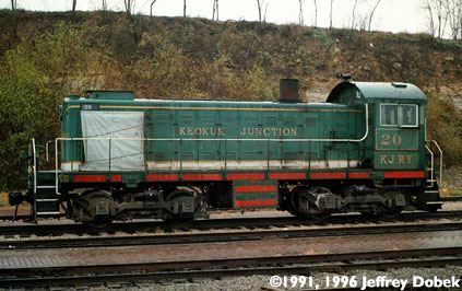 Switcher #405 was the regular engine in the Keokuk yard. Purchased from the Peoria & Pekin Union, it worked in P&PU colors (but with KJ lettering) until receiving orange in 1992. |