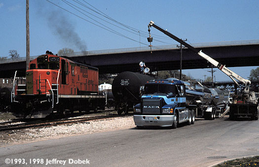 During the flood of 1993, the Hubinger Company tried to maintain production. Early in the flood, when the KJ could no longer switch the Hubinger plant, cars were temporarily loaded from trucks near the KJ office. |