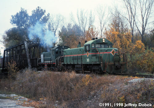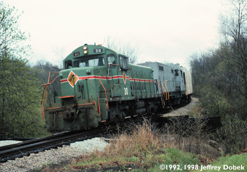 The grade descending into Hamilton was the steepest on the railroad. Here C&IM #30 leads KJRY #488 down following the mandated "safety stop" at the top of the grade. |