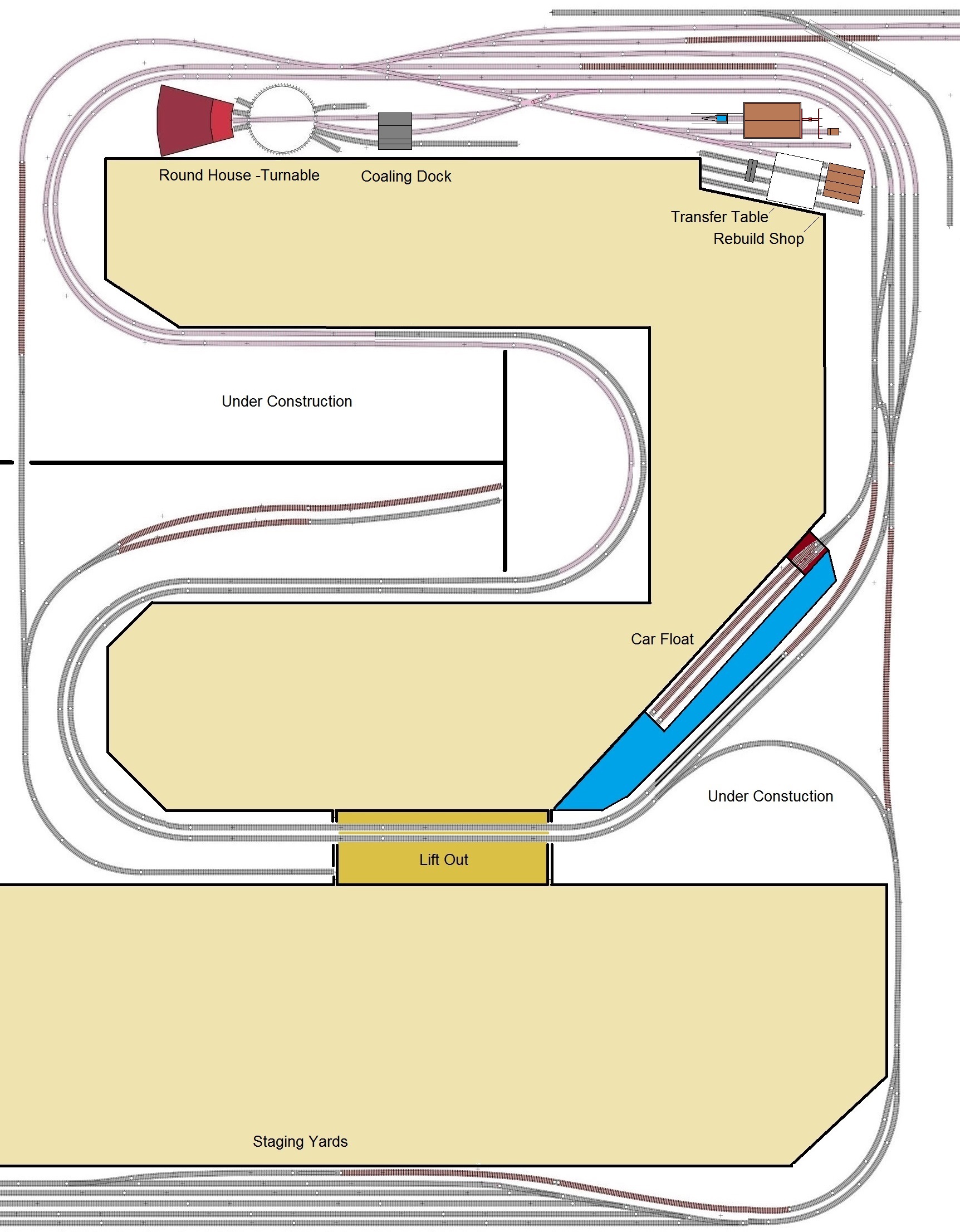 This layout is built in a 16' X 16' which was built just for the layout. With a staging yard in a connecting 6' x 16' room. In the first year of contruction I was been able to finish the room and complete the bench work of the layout. The biggest change of all my layouts has been the change to DCC. I now have a Digitrax Zephyr. The layout is wire so both DC and DCC can be ran.