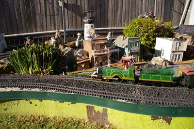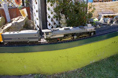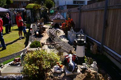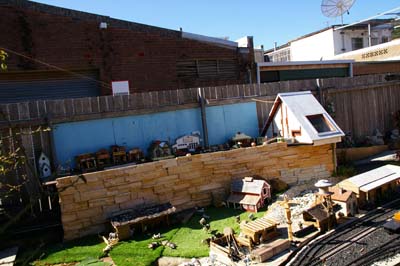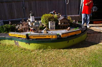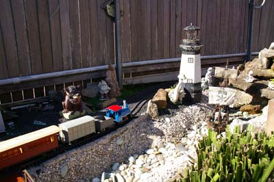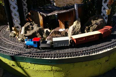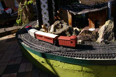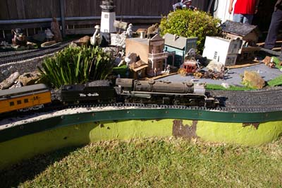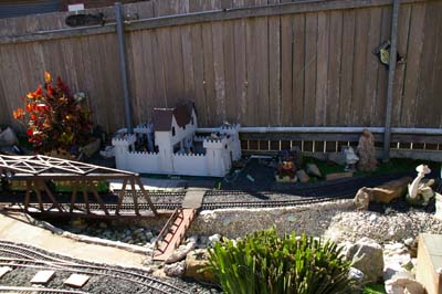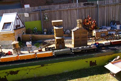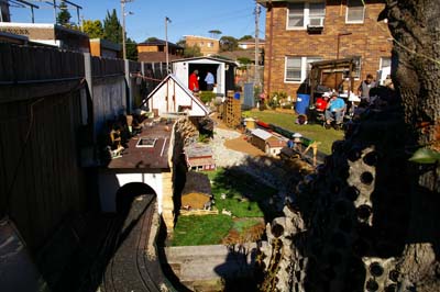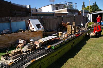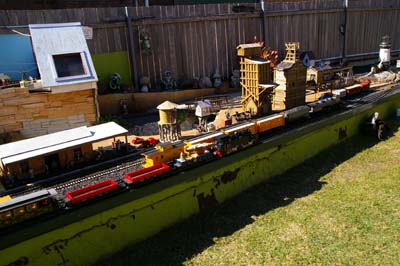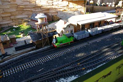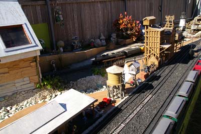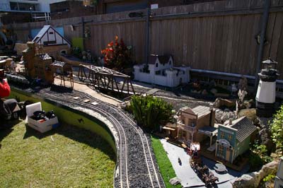 Doug's railway consists of a dual track main loop with a waterfall and river and overhead cable cars, a very nice layout.