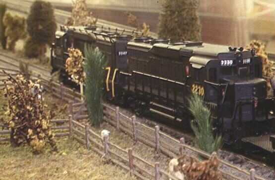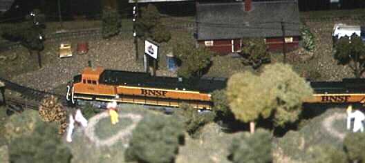 The Plexiglass panels around the outside are vital for preventing little (and not so little) hands touching the moving trains and causing derailments. It also contains major wrecks (which, fortunately, are few and far between), keeping cherished models from hitting the floor. This function is shared by the smaller Lexan panels where tracks run close to inside edges. The Motel 6 was added because it's the lodging of choice for our out of town shows. Despite the Plexiglass barrier, the motel's pool has a worn spot where people insist on touching it to see if the water is real. To see out portable layout in person, check the show schedule. We don't do as many shows as in the past, but there are still about 8-10 per year. |