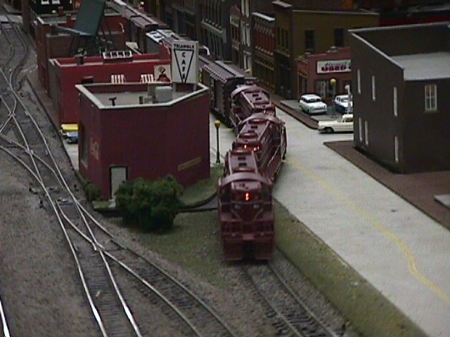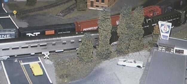 At one end, a trolley loop crosses the branch at two diamonds and ducks under the main line hill. This track can operate from either the overhead wire or regular 2-rail. The operator must be careful to avoid collisions with the train on the branch line. |