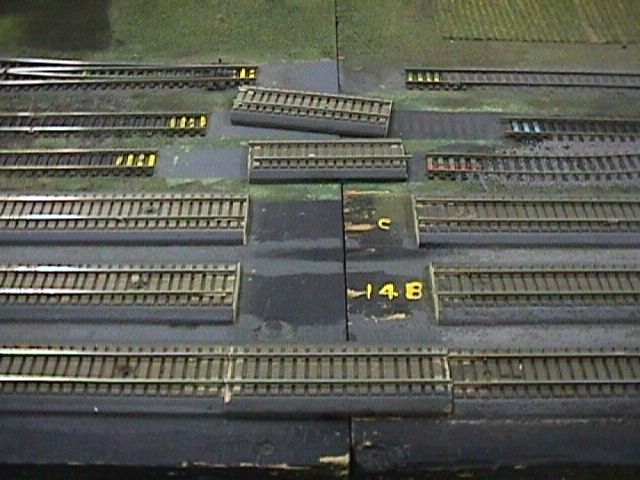 Where the layout sections meet, there are gaps in the track, with special pieces that fit into them. These connectors are held in place only by standard rail joiners. There are electrical jumpers underneath the layout so we don't have to depend on continuity through the connectors. |