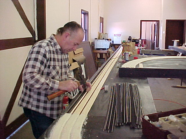 Where the layout sections meet, there are gaps in the rails, with special pieces that fit into them. These connectors are all the same length and interchangeable. They are held in place only by standard rail joiners. There are electrical jumpers underneath the layout so we don't have to depend on continuity through these joints. |