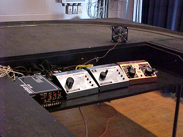Electrically, each loop is totally isolated from all the others. The branch line has a walkaround throttle, while the mains are controlled from throttles which sit in a tray inside one end of the layout. |