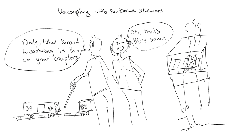 | To uncouple Kadee compatible couplers I use a home made uncoupling tool which is based on a design by Lionel Strang. I use the end of the tool to grab the 'brake hose' and separate the couplers. I make sure I have slack in the couplers before doing it so that the couplers have room to detach from each other. This tool works pretty well. I would never use a barbecue skewer to uncouple cars because it can damage the coupler and or the coupler pocket and knock the couplers out of alignment and cause them to be at an improper height. |