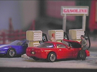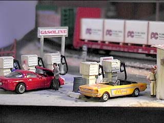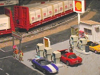 A group of muscle car enthusiasts stop for gas as they cruise route 66. This is the Shell gasoline station which is on old Route 66 in the north end of town. This area is about to be remodeled to make way for wider radius turns on the main line. The eminent domain rights of the railroad mean that this gas station might have to go. If after the remodel there is still some room for it, it will be up graded with better gas pumps.