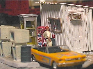 The building was scratch made from vertical blinds with a door, windows and air conditioning added on. The Pepsi machine was painted red and decals were applied.