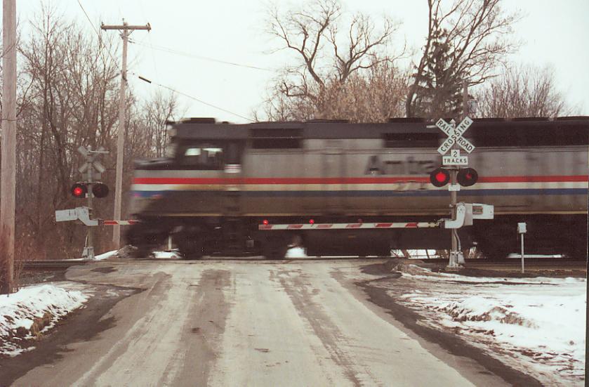 F40 #274 blasting through Centerport Rd Crossing near Weedsport, NY - early Spring 2001.