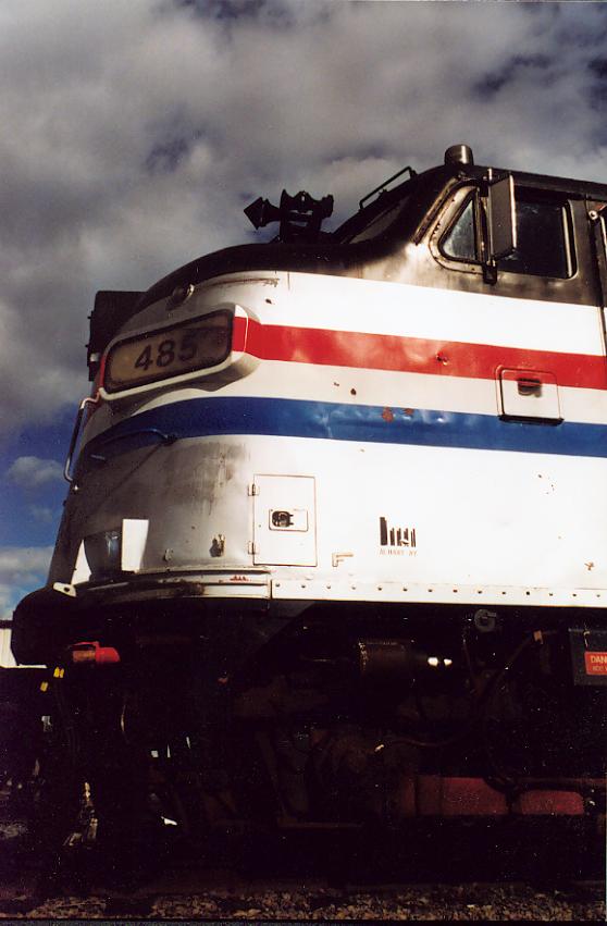 An artsy shot looking up at FL9 485, with the sun glowing on the FL9, and the darkening clouds over head, in Albany/Rensselaer, Summer 1998. Notice the cool little "Albany, NY" marking with the skyline of Albany on the side of the locomotive. Albany's solution to the "Chicago", "Los Angeles", etc., names on the white stripe of the F40s.