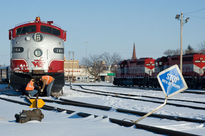 Conductor and engineer secure frozen hatches and air hoses on the 10A's pilot.