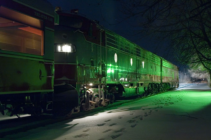 Artificial lights cast an eerie green glow as the engines idle at Walworth.