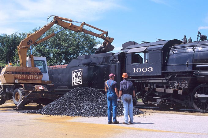 Members of the crew watch as coal is loaded into the tender. No,
