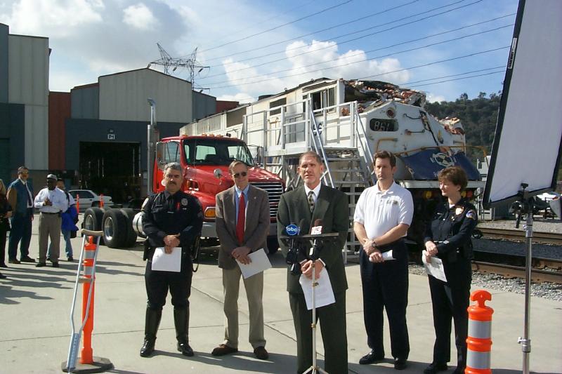 Left to right: A Glendale Police Department Representative, Eric Jacobsen, California Operation Lifesaver, Ed Pederson, Metrolink Manager Safety and Security, Steve Telliano, California Trucker's Association, Lt. Walker, Burbank Police Department "Due to the growing economy, more truckers are crossing our rails more often," stated Ed Pederson during the introduction with the news media in front of Engine #861 and a Ralphs truck. |