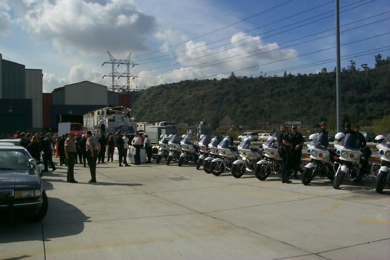 A convoy of Glendale and Burbank police motorcycles and cruisers get ready for the special train's departure. These officers rode ahead of the train and stationed themselves near the railroad crossings. |