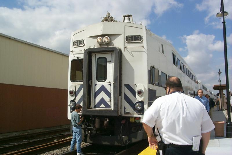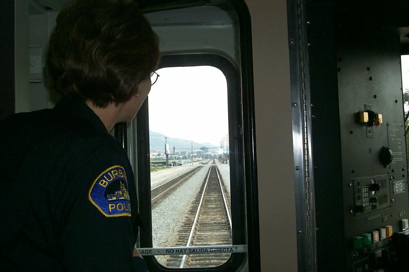 A few miles North of Burbank Airport Station, the special train stops and is prepared to reverse it's direction. The Police officers, Engineer and myself walk to the Cab Car #613. |