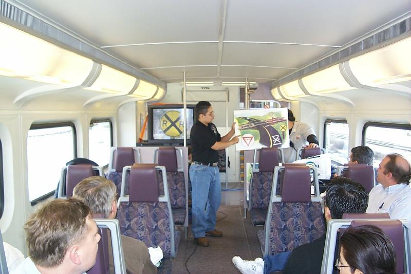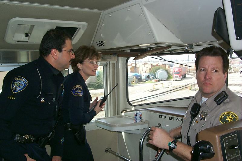 Concerned about the alarming increase in the number of collisions between trucks vs. Metrolink trains, Metrolink officials in cooperation with "Operation Lifesaver" hosted a special Trucker on the Train day as part of Metrolink Rail Safety Week. Truckers, and media personnel were invited along with Metrolink engineers to see for themselves how to avoid becoming involved in a collision. Along the way, law enforcement officials cited violators ignoring the flashing red crossing lights.